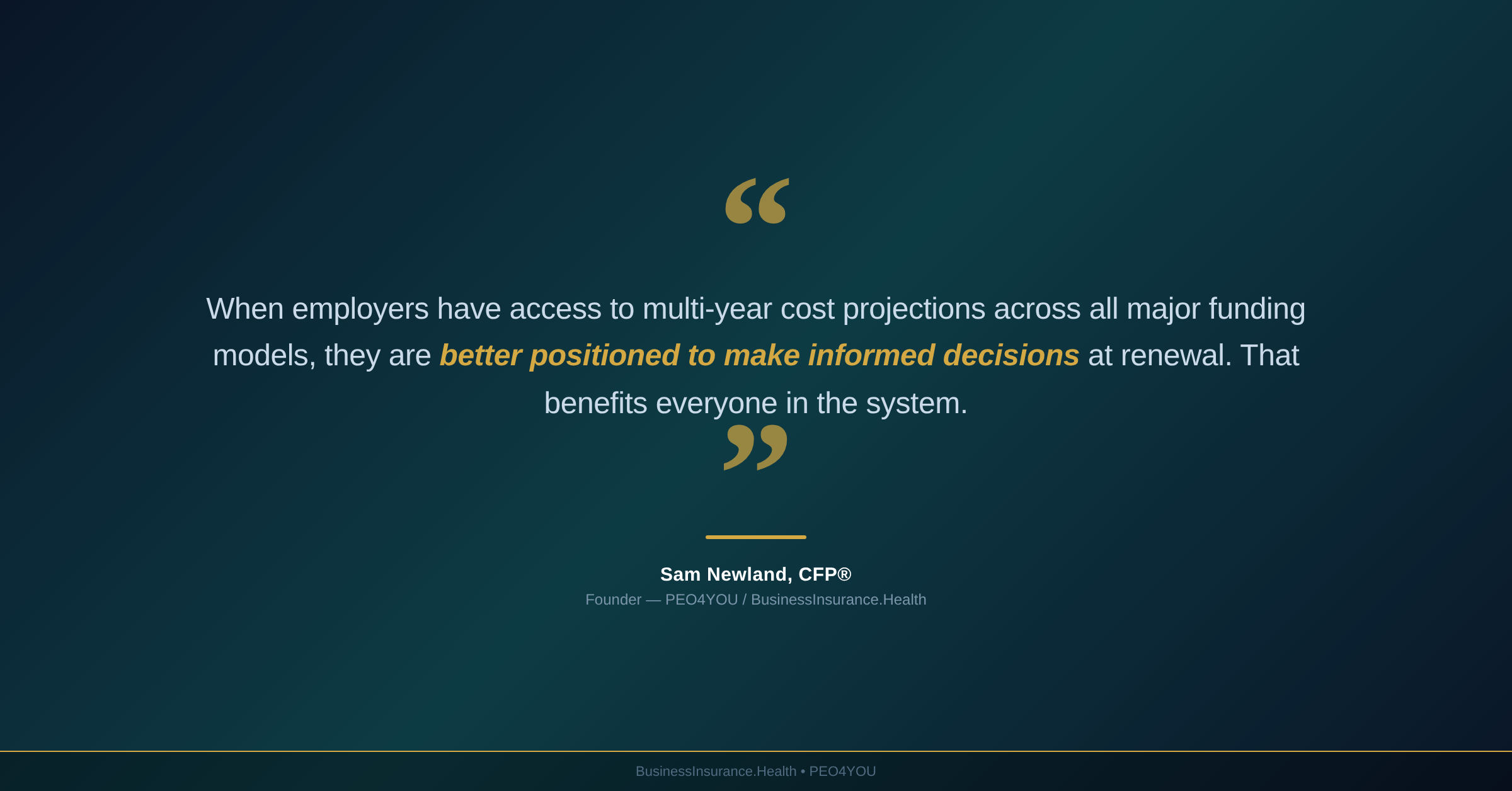 Quote graphic reading: When employers have access to multi-year cost projections across all major funding models, they are better positioned to make informed decisions at renewal. Attributed to Sam Newland, CFP, Founder of PEO4YOU and Business Insurance H